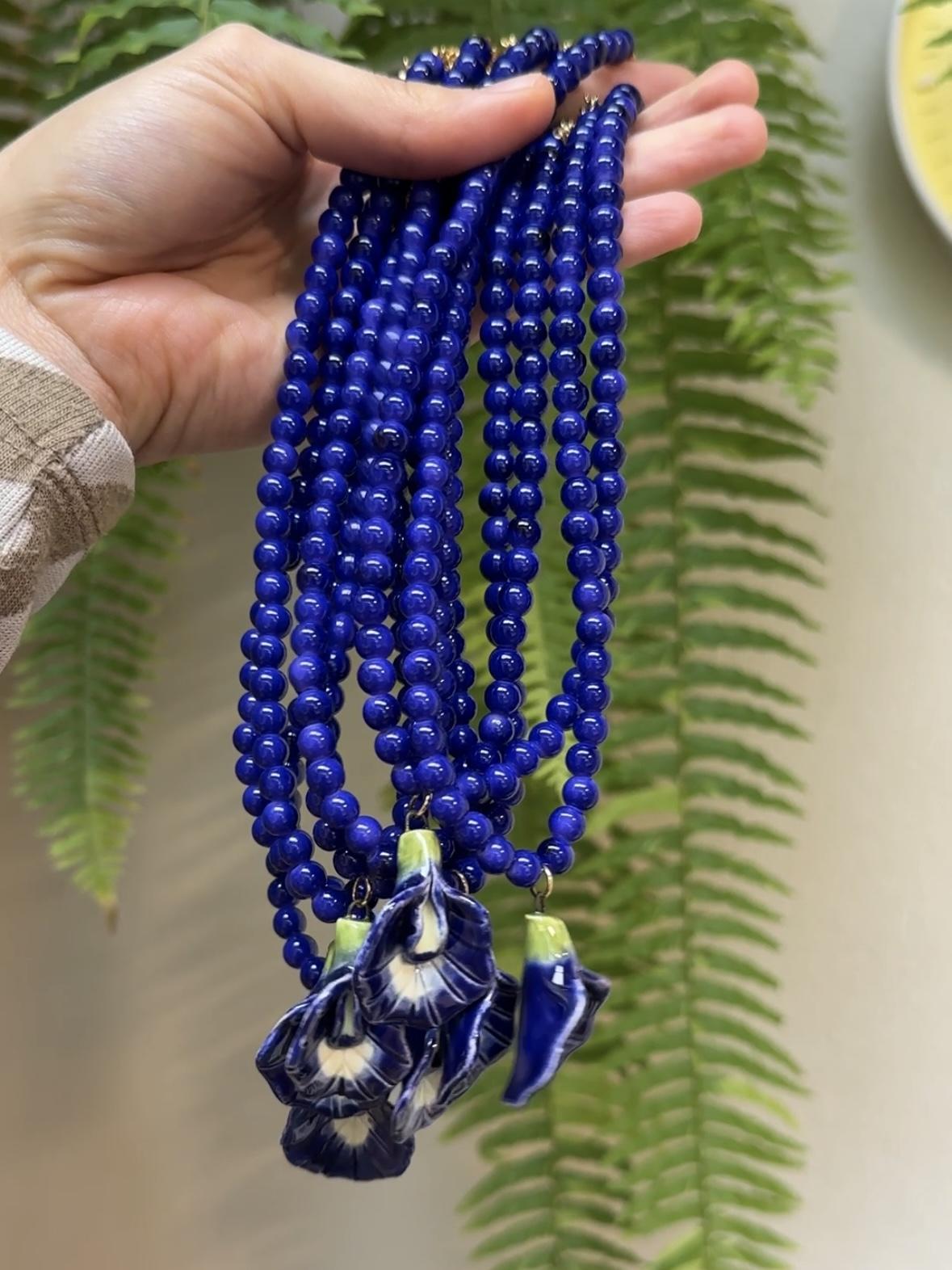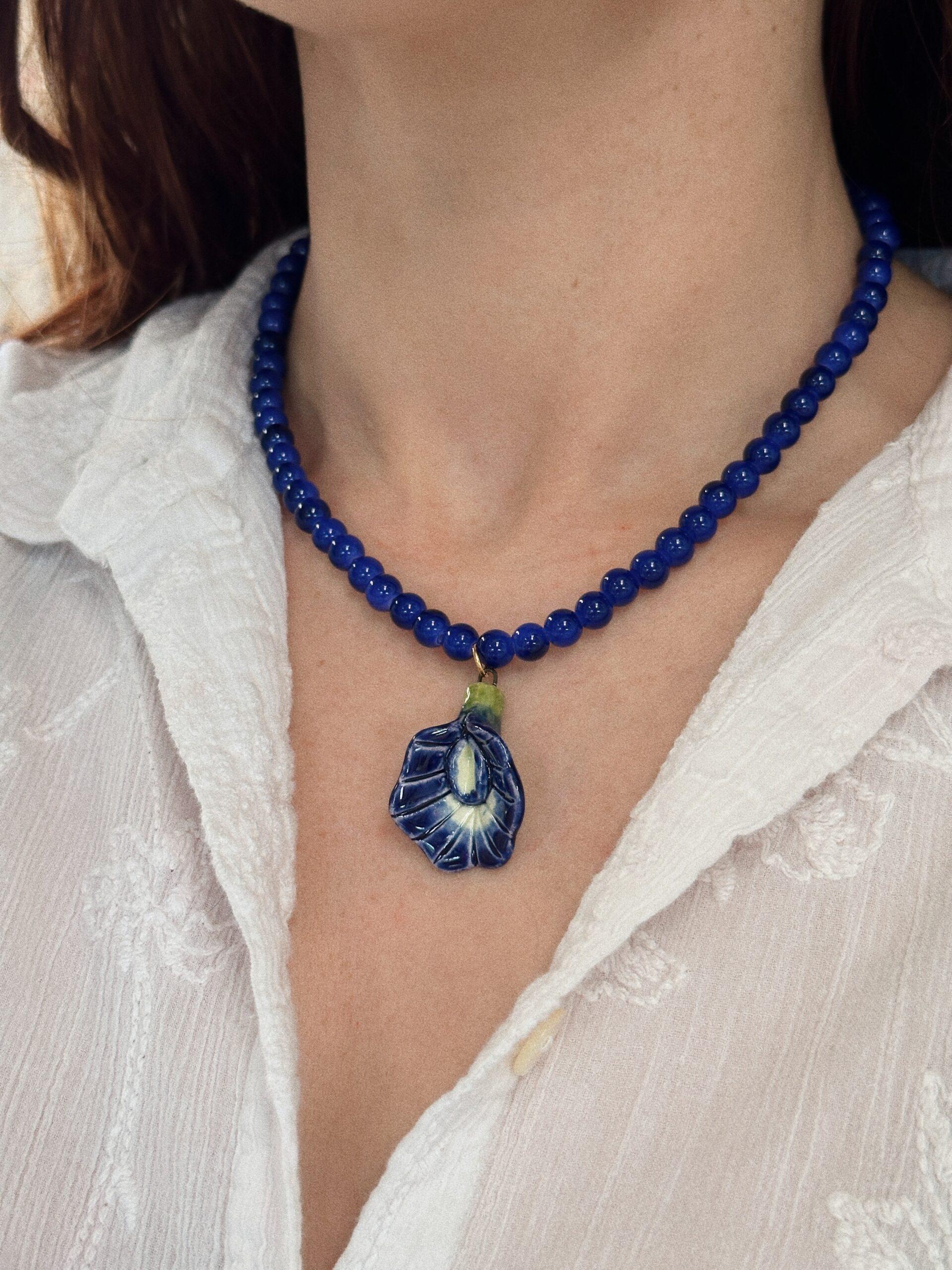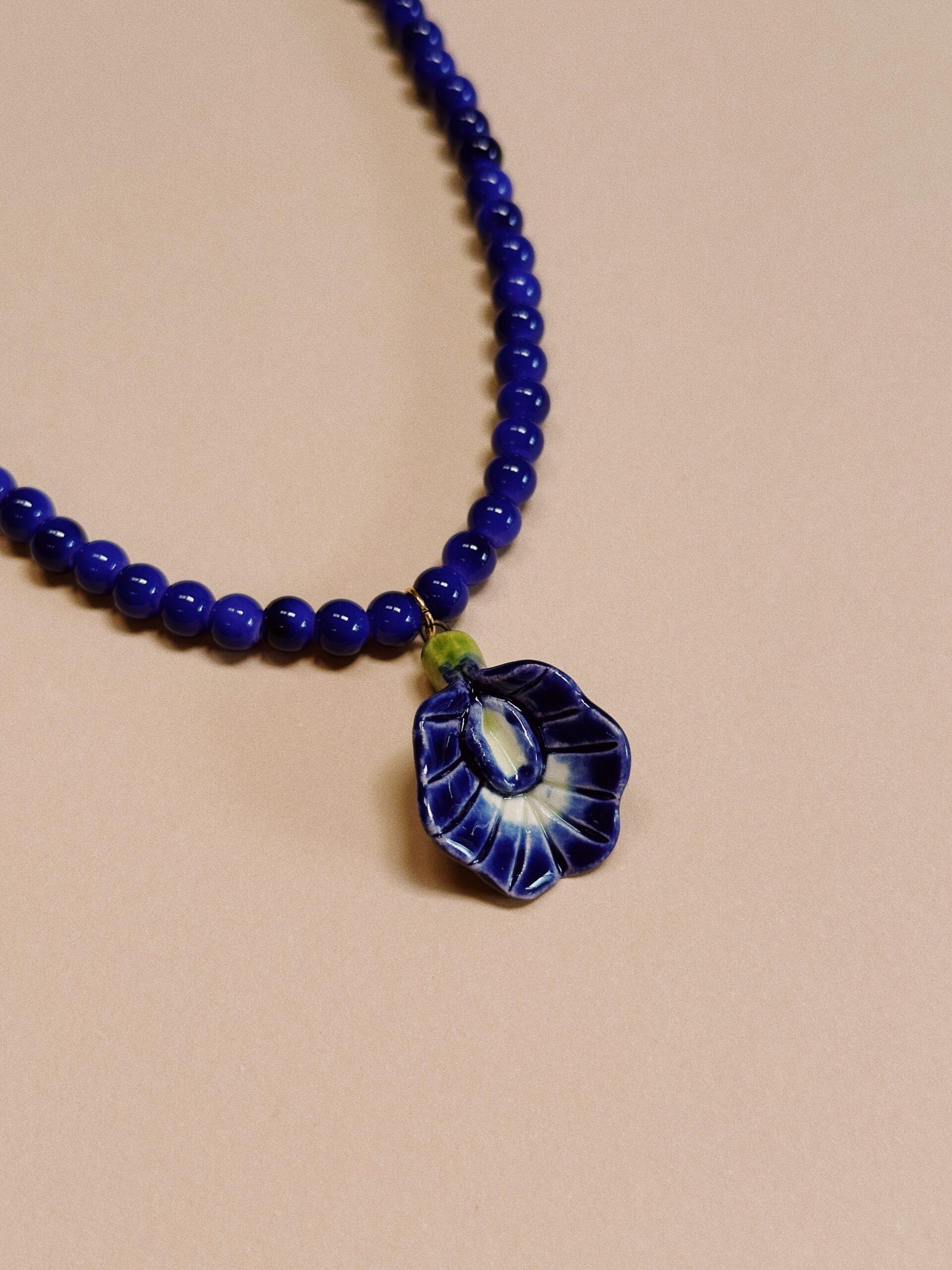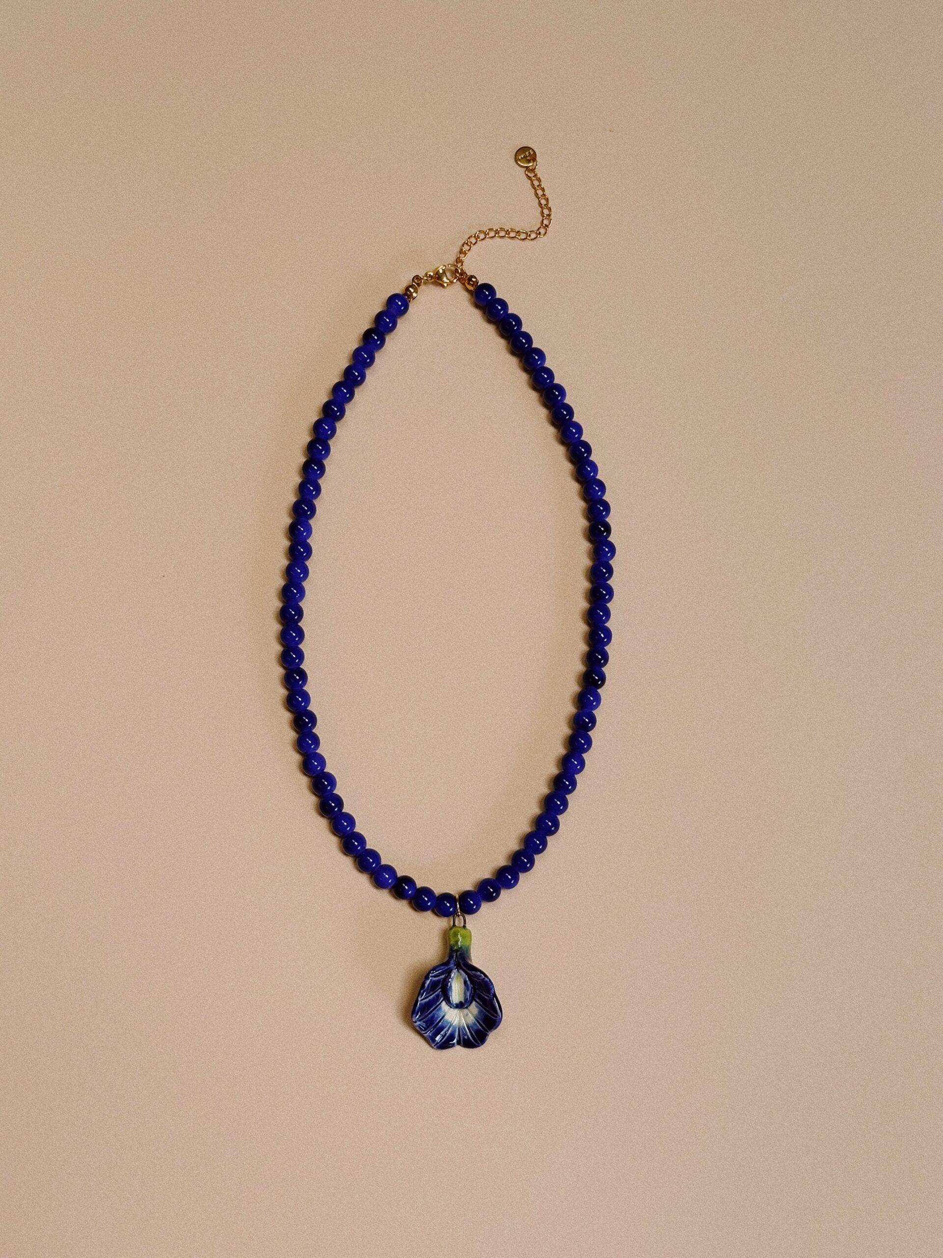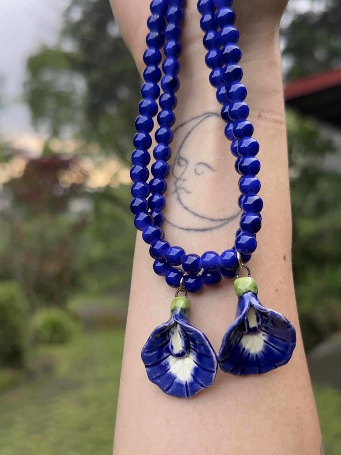 Delicada clitoria hecha y pintada a mano, con beads de vidrio. Cierre dorado.
