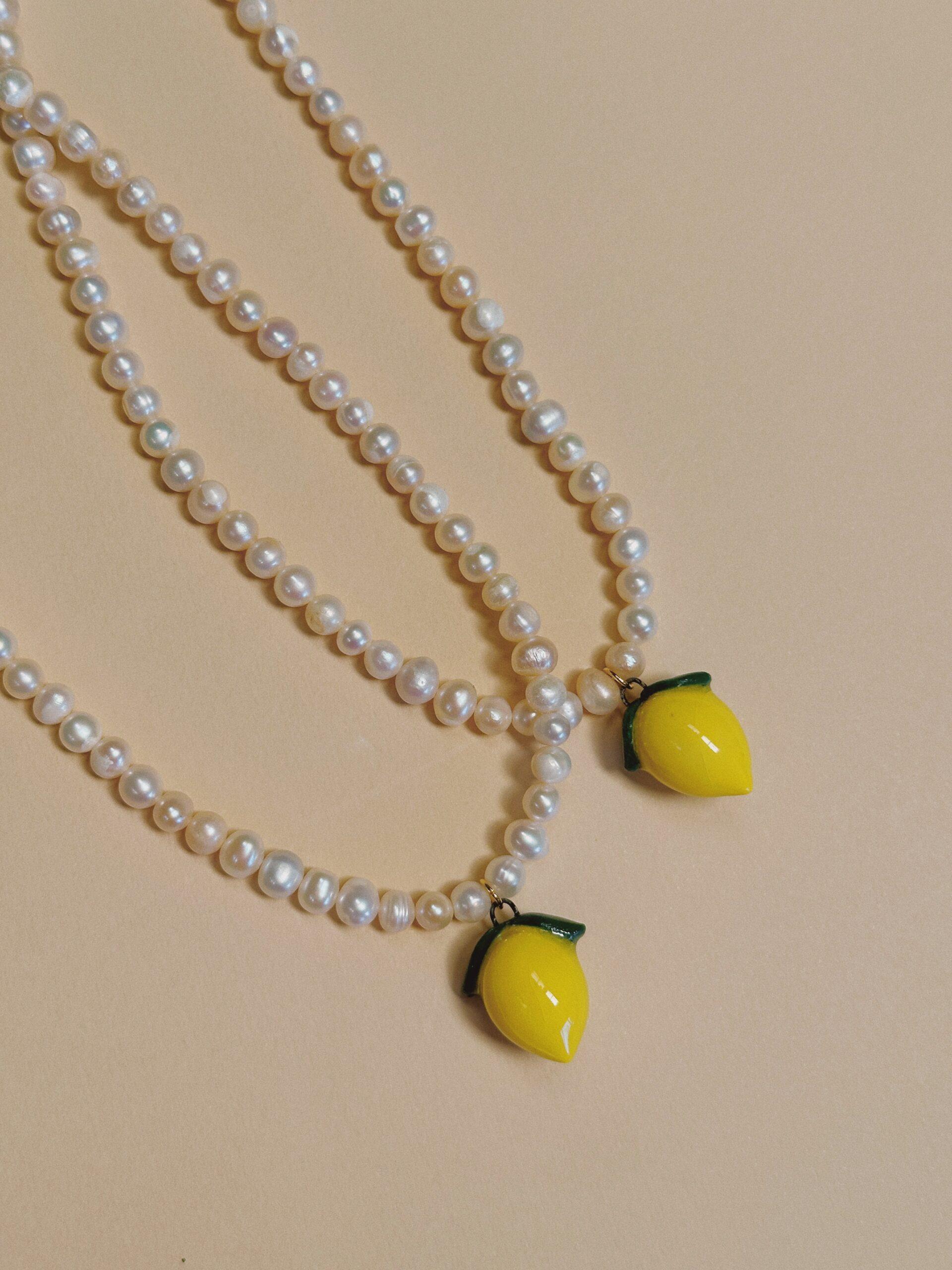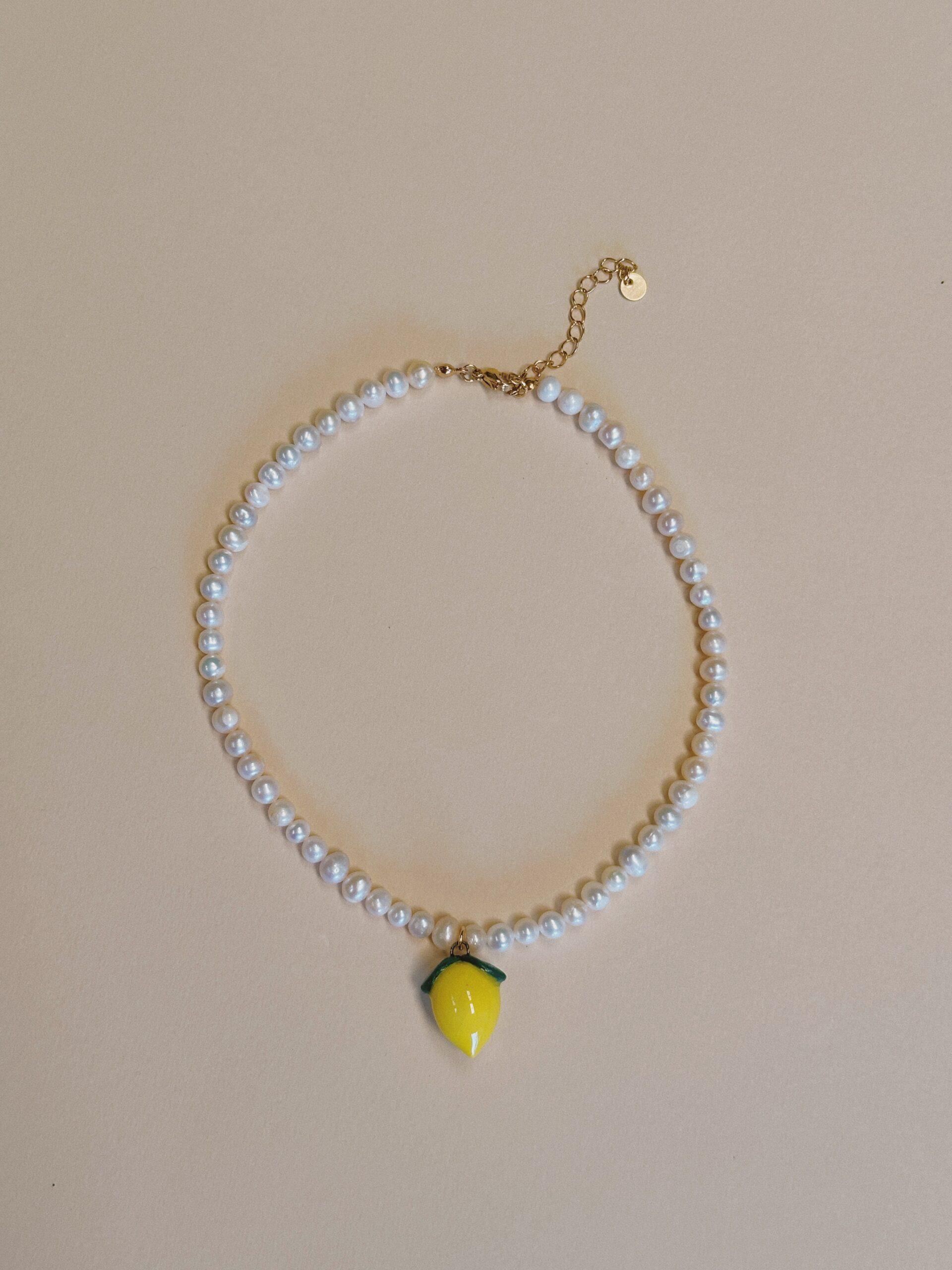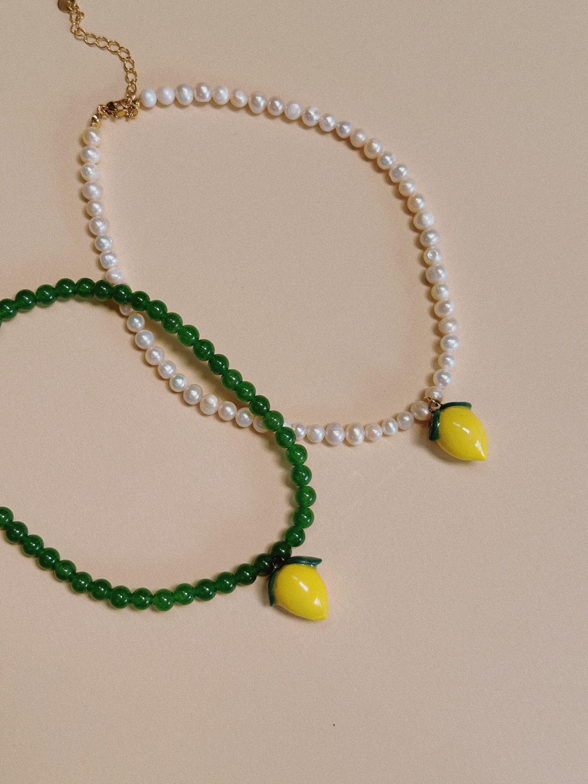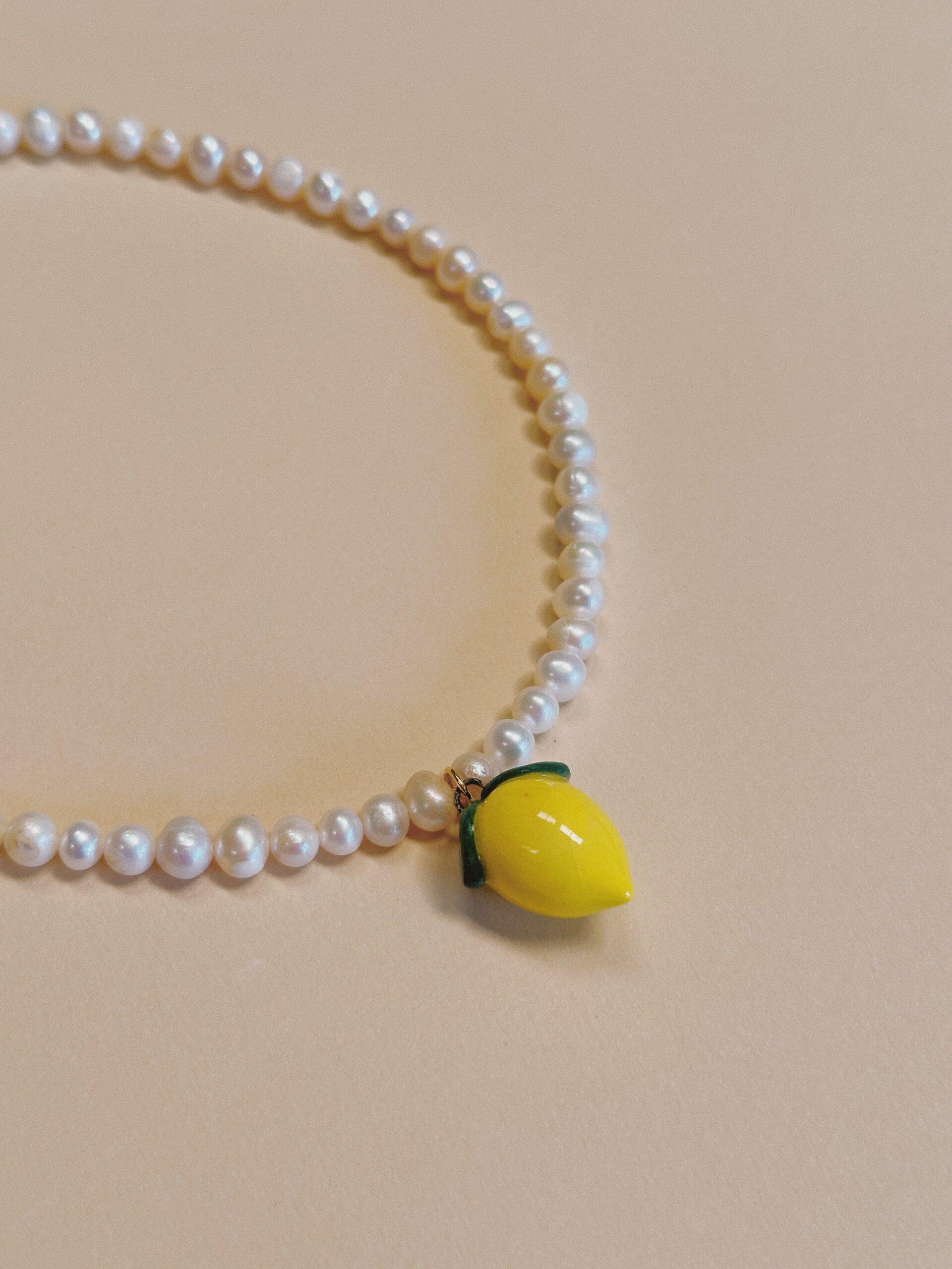 Dije de limón modelado y pintado a mano, acompañado de perlas naturales o jade 🍋