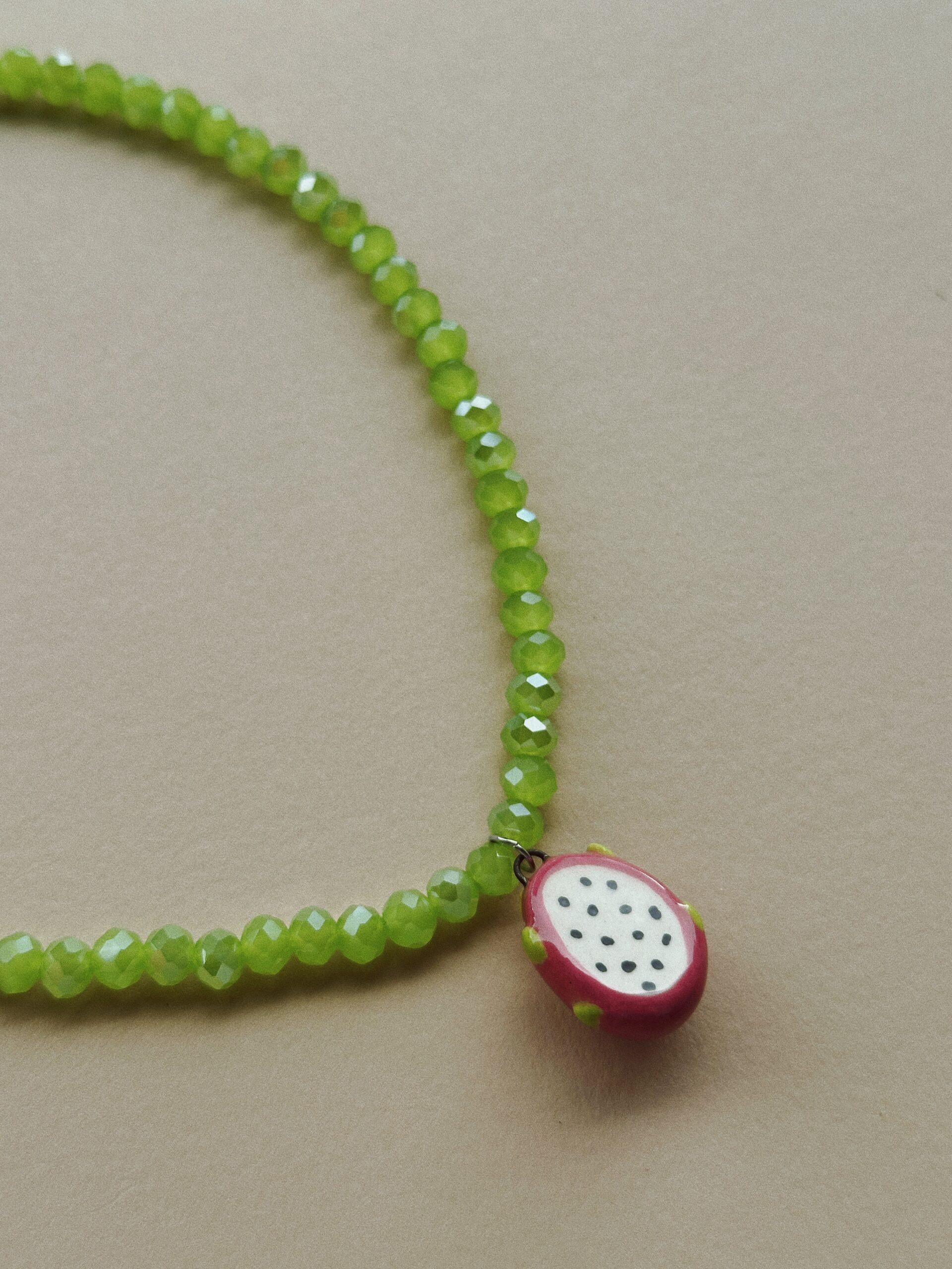 Collarcito de cristal facetado con una mini pitahaya modelada y pintada a mano. Cierres en plateado.