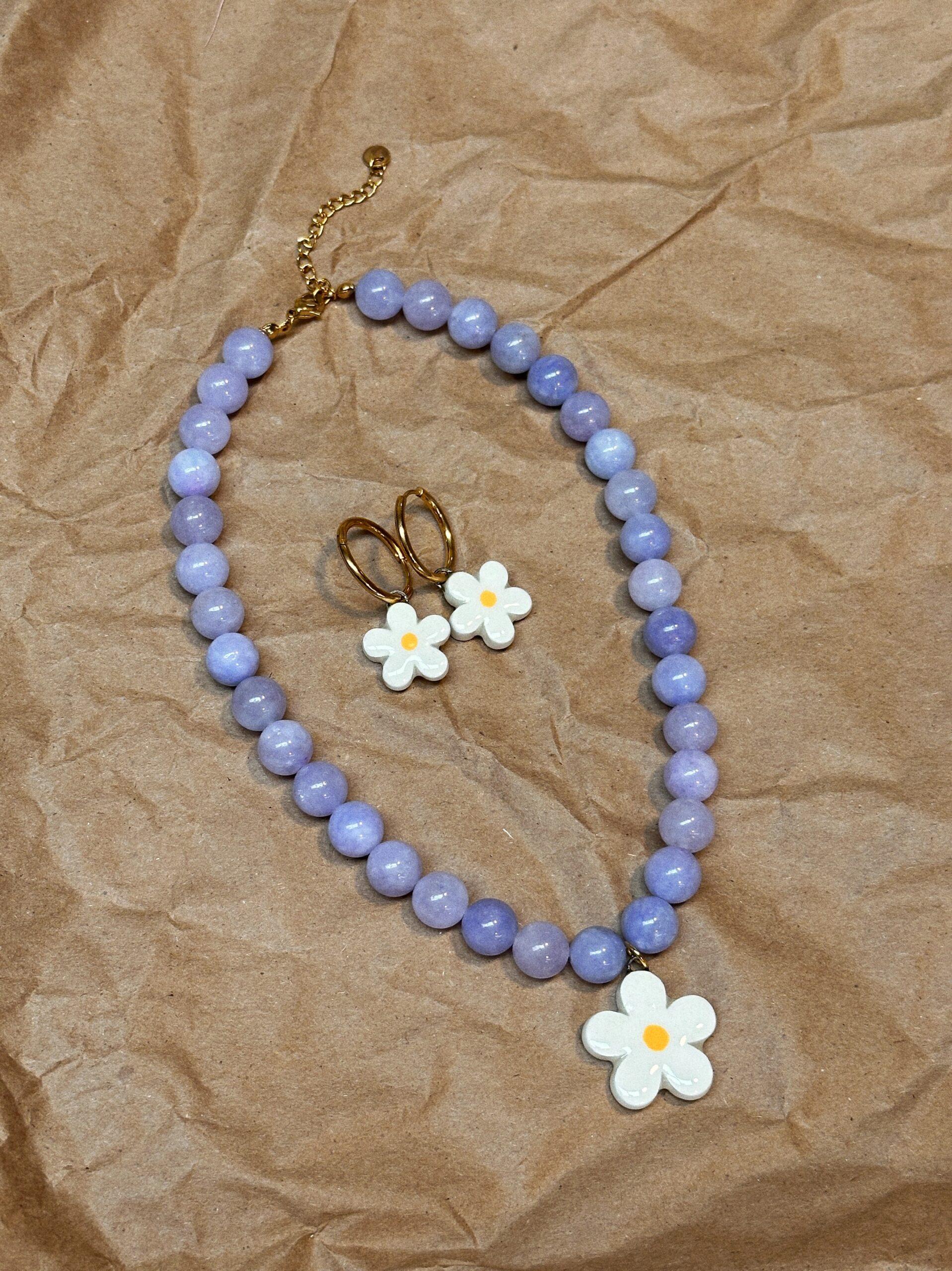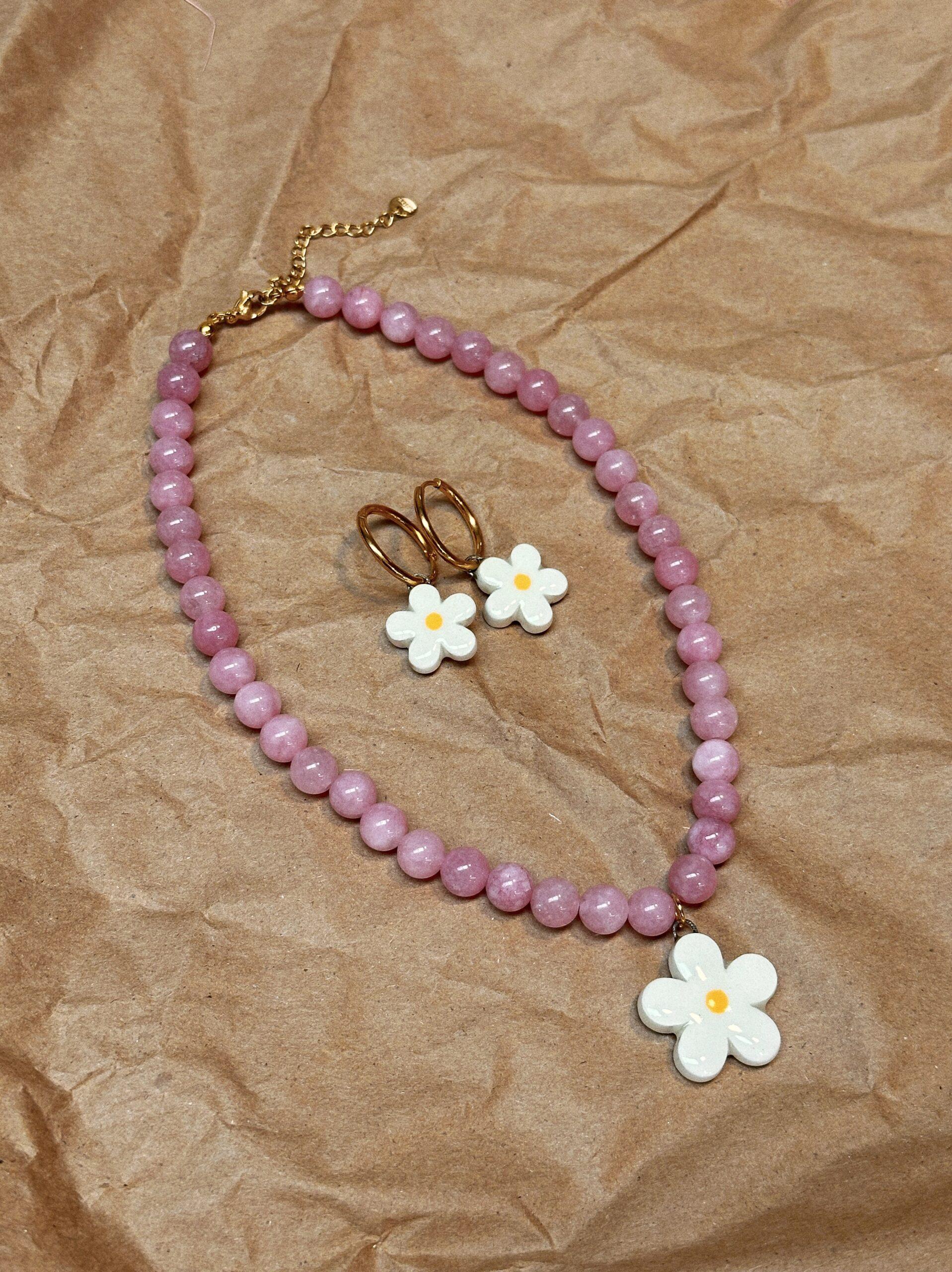 Set de collar + aretes de Margarita, con beads de piedras naturales, y cierre y argollas en dorado.